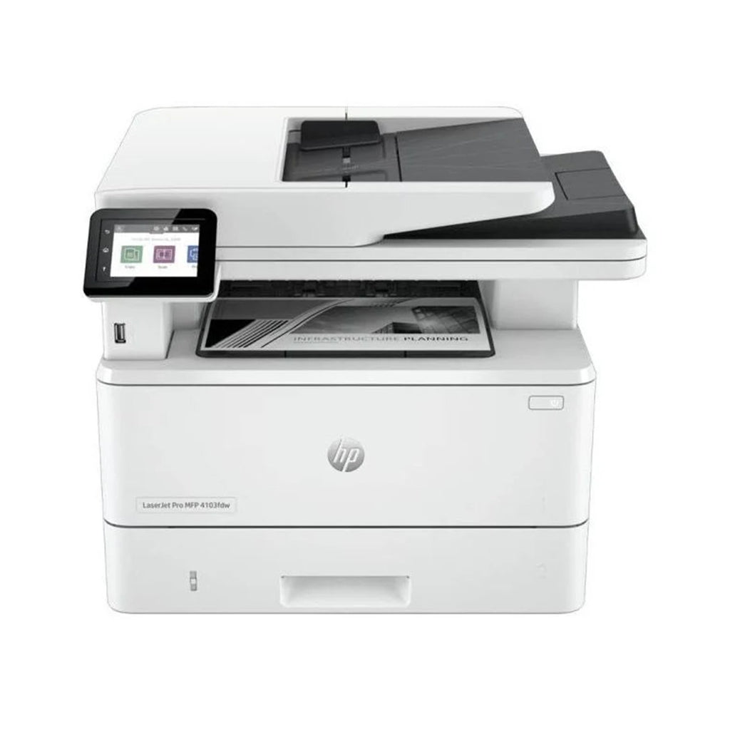 La HP LaserJet Pro MFP 4103FDW es una impresora multifuncional monocromática que ofrece soluciones de impresión, escaneo, copiado y fax para entornos empresariales que requieren eficiencia y alta productividad. Esta impresora láser está diseñada para manejar grandes volúmenes de trabajo con rapidez y precisión, proporcionando impresiones nítidas y claras con una resolución profesional. Su velocidad de impresión de hasta 40 páginas por minuto y su capacidad de impresión a doble cara automática optimizan el flujo de trabajo, reduciendo significativamente el tiempo de espera.