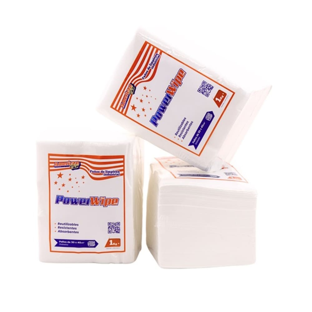 Paño de limpieza industrial, desarrollado y producido con telas no tejidas fabricadas con fibras de celulosa biodegradable que permiten una gran absorción de agua, aceite o tintas gráficas, reforzadas con fibras de polipropileno que le otorgan la resistencia necesaria requerida en labores de limpieza mecánica.